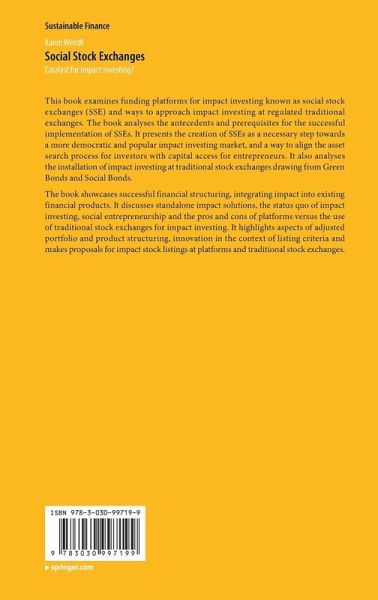 This book examines funding platforms for impact investing known as social stock exchanges (SSE) and ways to approach impact investing at regulated traditional exchanges. The book analyses the antecedents and prerequisites for the successful implementation of SSEs. It presents the creation of SSEs as a necessary step towards a more democratic and popular impact investing market, and a way to align the asset search process for investors with capital access for entrepreneurs. It also analyses the installation of impact investing at traditional stock exchanges drawing from Green Bonds and Social Bonds.