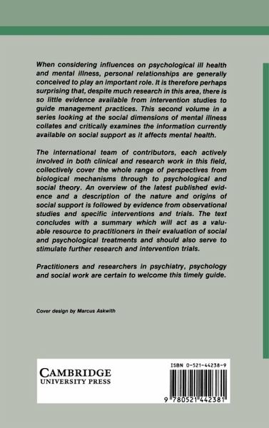 1. Social support and psychiatric disorder: overview of evidence; Part 1. Concepts and Origins of Social Suport: 2. Understanding social support within the context of theory and research on the relationship of life stress and mental health; 3. A developmental perspective on support networks; 4. Cognitive aspects of social support processes; 5. Attachment, co-operation and rank: the evolution of the need for status and social support; Part II. Lessons from Selected Observational Studies: 6. Social support as a high risk for depression in women; 7. The importance of context: who needs, and who does not need, social support among college students?; 8. Teenage peer network structures in the community as sources of social problems: a sociological perspective; Part III. Lessons from Intervention Studies: 9. Social network and mental health-an intervention study; 10. A test of the social support hypothesis; 11. Case management and network enhancement of the long-term mentally ill; 12. Expressed emotion: measurement, intervention and training issues; Part IV. Intervention Principles and Recommendation: 13. Social support processes and cognitive therapy; 14. Social support and psychiatric disorder: recommendations for clinical practice and research.