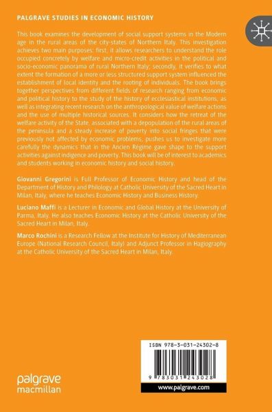 1. Between formality and informality: aiding strategies for the needy. The social support systems in Northern Italy.- 2. Between social support and establishment of social identities: the system of giving in the diocese of Tortona in the XVIII century.- 3. Social support systems in medieval Piedmont: The farming system of the hospital Sant'Andrea di Vercelli.- 4. Organising charity. Social support structures in the Genoese Domain during the Modern age.- 5. The ritual capital. Supporting economy in Spanish Lombardy countryside.- 6. Social support systems in imperial fiefs.- 7. Rural microcredit in the sharecropping northern provinces of the papal states (XVI-XIX cent.).- 8. Instruments and strategies of the social support system in the Brescia rural area during the XVIII century.- 9. Charity, healthcare and brotherhoods. Cases from the Venetian Terraferma in the Renaissance period.- 10. At a distance. Forms of social support in Friuli during the Modern age.- 11. Collective charities in the rural communities of Trentino (XVII-XVIII centuries).- 12. The role of Italian parishes in the Modern age "systems of giving".