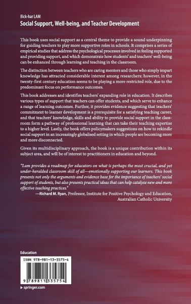 This book uses social support as a central theme to provide a sound underpinning for guiding teachers to play more supportive roles in schools. It comprises a series of empirical studies that address the psychological processes involved in feeling supported and providing support, and which demonstrate how students' and teachers' well-being can be enhanced through learning and teaching in the classroom. The distinction between teachers who are caring mentors and those who simply impart knowledge has attracted considerable interest among researchers; however, in the twenty-first century education seems to be playing a more restricted role, due to the predominant focus on performance outcomes. This book addresses and identifies teachers' expanding role in education. It describes various types of support that teachers can offer students, and which serve to enhance a range of learning outcomes. Further, it provides evidence suggesting that teachers' commitment to learner development is a prerequisite for a satisfying teaching career, and that teachers' knowledge, skills and ability to provide social support in the classroom form a pathway of professional learning that can take their teaching expertise to a higher level. Lastly, the book offers policymakers suggestions on how to rekindle social support in an increasingly globalised setting in which people are becoming more and more disconnected. Given its multidisciplinary approach, the book is a unique contribution within its subject area, and will be of interest to practitioners in education and beyond.