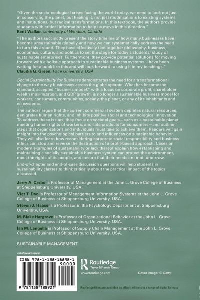 Social Sustainability for Business demonstrates the need for a transformational change to the way businesses across the globe operate. What has become the standard, accepted "business model," with a focus on corporate profit, shareholder wealth maximization, and GDP growth, is no longer a sustainable business model for workers, consumers, communities, society, the planet, or any of its inhabitants and ecosystems.