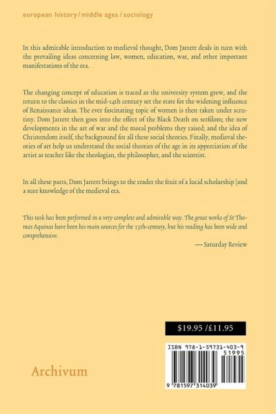 In this admirable introduction to medieval thought, Dom Jarrett deals in turn with the prevailing ideas concerning law, women, education, war, and other important manifestations of the era. The changing concept of education is traced as the university system grew, and the return to the classics in the mid-14th century set the state for the widening influence of Renaissance ideas. The ever fascinating topic of women is then taken under scrutiny. Dom Jarrett then goes into the effect of the Black Death on serfdom; the new developments in the art of war and the moral problems they raised; and the idea of Christendom itself, the background for all these social theories. Finally, medieval theories of art help us understand the social theories of the age in its appreciation of the artist as teacher like the theologian, the philosopher, and the scientist. In all these parts, Dom Jarrett brings to the reader the fruit of a lucid scholarship [and a sure knowledge of the medieval era. This task has been performed in a very complete and admirable way. The great works of St Thomas Aquinas have been his main sources for the 13th-century, but his reading has been wide and comprehensive. - Saturday Review