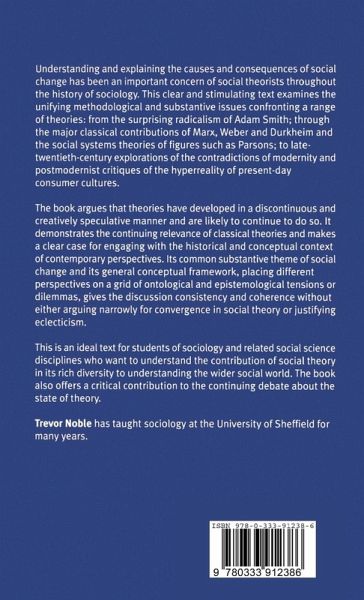 Understanding and explaining the causes and consequences of social change has been an important concern of social theorists throughout the history of sociology. This wide-ranging text focuses on a rich and diverse body of theoretical work, from Adam Smith and Comte to Lyotard and Baudrillard, in order to demonstrate the relevance of both classical and contemporary social theory to the wider social world and to show that, while social theory may not deliver all the answers we might like, it does improve the quality of the questions we can ask about how social change comes about, what its effects are and where it is leading us.