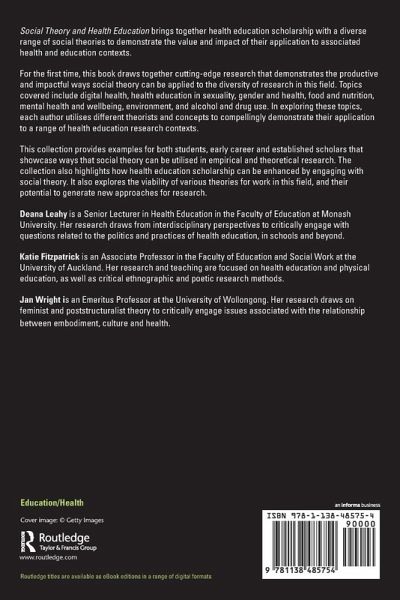 List of Figures, Tables and Boxes List of Contributors Chapter 1: Why Do We Need Social Theory in Health Education? Deana Leahy, Katie Fitzpatrick and Jan Wright Chapter 2: Working with Social Theory in Health Education Mary Lou Rasmussen Chapter 3: Biopedagogies and Family Life: A Social Class Perspective Lisette Burrows and Jan Wright Chapter 4: The Ontological Politics of Partying: Drug Education, Young Men and Drug Consumption Adrian Farrugia Chapter 5: Using Bourdieu To Understand Health and Education Katie Fitzpatrick Chapter 6: Poststructuralist and New-Materialist Approaches to Analyses of Bullying Among Children Nina Hein and Dorte Marie Søndergaard Chapter 7: Vital Materialism and The Thing-Power of Lively Digital Data Deborah Lupton Chapter 8: Assembling Affects: A Deleuzo-Guattarian Approach to School Drug Education Peta Malins and Nicholas Kent Chapter 9: Critical Policy Studies and Historical Sociology of Concepts: Wellbeing and Mindfulness in Education Julie Mcleod and Katie Wright Chapter 10: 'School Refusal': What is the Problem Represented to Be? A Critical Analysis Using Carol Bacchi's Questioning Approach Catriona O'Toole and Roisin Devenney Chapter 11: Health Education Policy and Curriculum: Bernsteinian Perspectives and A Whole New Ball Game Dawn Penney Chapter 12: Navigating Health Knowledge: Postcolonialism And Ethnic Minority Girls' Experiences of Health Education in School Contexts Leanne Petherick And Moss E. Norman Chapter 13: Governmentality, School Nutrition and The International Practice of Governing Health Behaviours Darren Powell and Carolyn Pluim Chapter 14: 'Deleuze For Goodness Sake': Examining Health Inequities Via Assemblage Theorising Richard Pringle Chapter 15: Re/Doing Sexuality Education Research as A Rhizomatic Pedagogical Encounter and Its Educational Implications Kathleen Quinlivan Chapter 16: Education as Products and Productions of Norms Eva Reimers Chapter 17: Digital Health Technologies, Body Pedagogies and Material-Discursive Relations of Young People's Learning About Health Emma Rich, Sarah Lewis and Andy Miah Chapter 18: Putting Foucauldian Ethics to Work in Critical Health Education Karen Shelley and Louise Mccuaig Chapter 19: Engaging with Normativity in Health Education Research: Inspiration from Continental Critical Theory Venka Simovska, Nis Langer Primdahl and Anders Skriver Jensen Chapter 20: Destroying the Family and Civilization: Marxism, Safe Schools and Sexuality Education Roz Ward Chapter 21: Beyond Carrot Sticks and Sermons: The Practice of Education in Obesity Interventions Megan Warin Chapter 22: Public Health Pedagogy and Technology as a Mode of Existence Benjamin Williams and Jessica Le