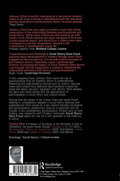 In this compelling book, Anthony Elliott traces the rise of psychoanalysis from the Frankfurt School to postmodernism. Examining how pathbreaking theorists such as Adorno, Marcuse, Lacan and Lyotard have deployed psychoanalysis to politicise issues such as desire, sexuality, repression and identity, Elliott assesses the gains and losses arising from this appropriation of psychoanalysis in social theory and cultural studies. Moving from the impact of the Culture Wars and recent Freud-bashing to contemporary debates in social theory, feminism and postmodernism, Elliott argues for a new alliance between sociological and psychoanalytic perspectives.