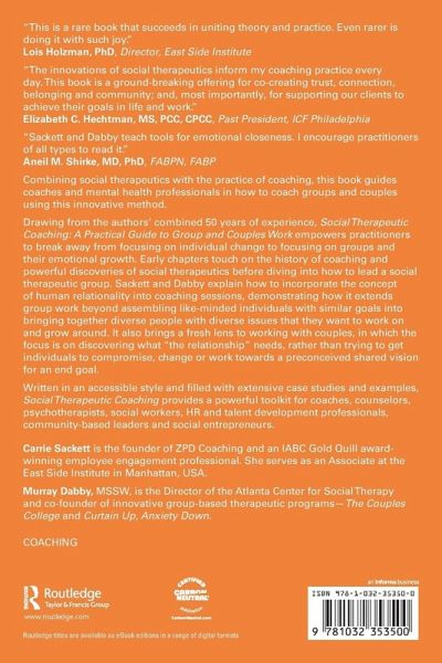 Drawing from the authors' combined 50 years of experience, Social Therapeutic Coaching: A Practical Guide to Group and Couples Work empowers practitioners to break away from focusing on individual change to focusing on groups and their emotional growth. Early chapters touch on the history of coaching and powerful discoveries of social therapeutics before diving into how to lead a social therapeutic group. Sackett and Dabby explain how to incorporate the concept of human relationality into coaching sessions, demonstrating how it extends group work beyond assembling like-minded individuals with similar goals into bringing together diverse people with diverse issues that they want to work on and grow around. It also brings a fresh lens to working with couples, in which the focus is on discovering what "the relationship" needs, rather than trying to get individuals to compromise, change or work towards a preconceived shared vision for an end goal.