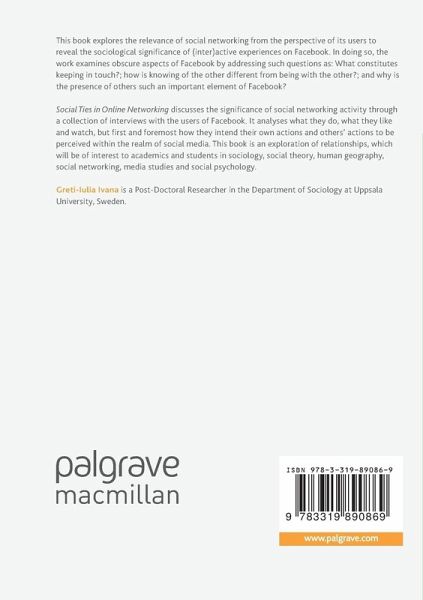 Social Ties in Online Networking discusses the significance of social networking activity through a collection of interviews with the users of Facebook. It analyses what they do, what they like and watch, but first and foremost how they intend their own actions and others' actions to be perceived within the realm of social media. This book is an exploration of relationships, which will be of interest to academics and students in sociology, social theory, human geography, social networking, media studies and social psychology.