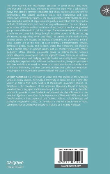 Part I: Identity and Equality.- Chapter 1. Challenges Facing India, Myanmar and Thailand: The Future of Democratic Progress (Chosein Yamahata, Yoshikazu Mikami and Terapatt Vannaruemol).- Chapter 2. "The Revolution of the Spirit" and Beyond: The Role of Social Transformation in Aung San Suu Kyi's Political Philosophy (Michal Lubina).- Chapter 3. Environmental Awareness as a Trigger in Constructing Ethnic Identity among the Tangkhul Nagas, Northeast India (Satoshi Ota).- Chapter 4. Reducing the Level of Ethno-Cultural Tensions in Thailand: Transformation through National Unity with Otherness (Takashi Tsukamoto).- Chapter 5. Muslim Women in Modern India: Public Debates from Identity to Religious Freedom to the Citizenship Amendment Act (Kanupriya Dua).- Chapter 6. Seeking Common Ground and Reconciliation: Islam, Thai Citizenship and Multiculturalism (Takashi Tsukamoto).- Chapter 7. Unfairness to Fairness: The (Im)Possible Way to Promote Gender Equality in Thai Politics ( Pradit Chinudomsud and Thanikun Chantra).- Chapter 8. Social Policies as Vehicles of Transformation for Women in India: Review of the Post-Globalisation Era (Rekha Mistry and Anuj Ghanekar).- Chapter 9. "The West Betrayed?" Buddhism, the Lady and Xenophobia in Myanmar/Burma (Donald M. Seekins).- Part II: Grassroots Communication.- Chapter 10. Borderland Economies, Service Delivery, Disarmament, Demobilisation and Reintegration: Beyond Myanmar's Moribund Peace Process (Bobby Anderson).- Chapter 11. Grassroots Mobilisation after a Large-Scale Disaster: Examining the Effects of Saving Groups in Myanmar (Naw Thiri May Aye).- Chapter 12. Transforming Differences through Women's Initiatives in Myanmar: Forging an Inter-Ethnic Alliance for Grassroots Peace (Makiko Takeda).- Chapter 13. Education Model Development of Media Health Literacy for Adolescents in Upper Northern Thailand: A Process of Change for Social Upliftment (Kwanfa Sriprapandh).- Chapter 14. Bridging Divides in Northeast India: Rethinking Nationalism and Democratic Communication towards a Common Cause (Malem Ningthouja).- Chapter 15. Media Literacy in Thailand as a Key in Communication to Strengthen Democratic Society (Pimonpan Chainan).- Chapter 16. Turbulence in Thailand? The Thai Digital Civil Rights Movement and a 'Pro-human' Contract for the Web (Michael J. Day and Merisa Skulsuthavong).- Chapter 17. Japan's Democracy Assistance to Myanmar: Few Seeds in Infertile Soil (David M. Potter).- Chapter 18. Strengthening Civic Vision to Bridge Divisions (Chosein Yamahata and Makiko Takeda).