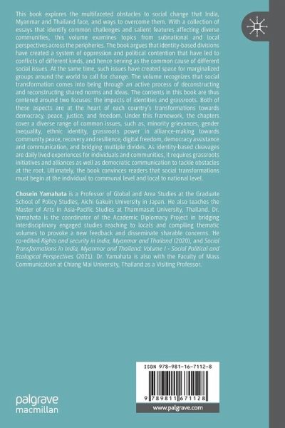 Part I: Identity and Equality.- Chapter 1. Challenges Facing India, Myanmar and Thailand: The Future of Democratic Progress (Chosein Yamahata, Yoshikazu Mikami and Terapatt Vannaruemol).- Chapter 2. "The Revolution of the Spirit" and Beyond: The Role of Social Transformation in Aung San Suu Kyi's Political Philosophy (Michal Lubina).- Chapter 3. Environmental Awareness as a Trigger in Constructing Ethnic Identity among the Tangkhul Nagas, Northeast India (Satoshi Ota).- Chapter 4. Reducing the Level of Ethno-Cultural Tensions in Thailand: Transformation through National Unity with Otherness (Takashi Tsukamoto).- Chapter 5. Muslim Women in Modern India: Public Debates from Identity to Religious Freedom to the Citizenship Amendment Act (Kanupriya Dua).- Chapter 6. Seeking Common Ground and Reconciliation: Islam, Thai Citizenship and Multiculturalism (Takashi Tsukamoto).- Chapter 7. Unfairness to Fairness: The (Im)Possible Way to Promote Gender Equality in Thai Politics ( Pradit Chinudomsud and Thanikun Chantra).- Chapter 8. Social Policies as Vehicles of Transformation for Women in India: Review of the Post-Globalisation Era (Rekha Mistry and Anuj Ghanekar).- Chapter 9. "The West Betrayed?" Buddhism, the Lady and Xenophobia in Myanmar/Burma (Donald M. Seekins).- Part II: Grassroots Communication.- Chapter 10. Borderland Economies, Service Delivery, Disarmament, Demobilisation and Reintegration: Beyond Myanmar's Moribund Peace Process (Bobby Anderson).- Chapter 11. Grassroots Mobilisation after a Large-Scale Disaster: Examining the Effects of Saving Groups in Myanmar (Naw Thiri May Aye).- Chapter 12. Transforming Differences through Women's Initiatives in Myanmar: Forging an Inter-Ethnic Alliance for Grassroots Peace (Makiko Takeda).- Chapter 13. Education Model Development of Media Health Literacy for Adolescents in Upper Northern Thailand: A Process of Change for Social Upliftment (Kwanfa Sriprapandh).- Chapter 14. Bridging Divides in Northeast India: Rethinking Nationalism and Democratic Communication towards a Common Cause (Malem Ningthouja).- Chapter 15. Media Literacy in Thailand as a Key in Communication to Strengthen Democratic Society (Pimonpan Chainan).- Chapter 16. Turbulence in Thailand? The Thai Digital Civil Rights Movement and a 'Pro-human' Contract for the Web (Michael J. Day and Merisa Skulsuthavong).- Chapter 17. Japan's Democracy Assistance to Myanmar: Few Seeds in Infertile Soil (David M. Potter).- Chapter 18. Strengthening Civic Vision to Bridge Divisions (Chosein Yamahata and Makiko Takeda).