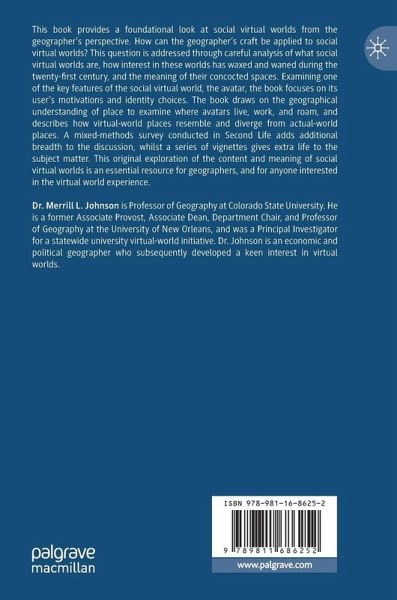 This book provides a foundational look at social virtual worlds from the geographer's perspective. How can the geographer's craft be applied to social virtual worlds? This question is addressed through careful analysis of what social virtual worlds are, how interest in these worlds has waxed and waned during the twenty-first century, and the meaning of their concocted spaces. Examining one of the key features of the social virtual world, the avatar, the book focuses on its user's motivations and identity choices. The book draws on the geographical understanding of place to examine where avatars live, work, and roam, and describes how virtual-world places resemble and diverge from actual-world places. A mixed-methods survey conducted in Second Life adds additional breadth to the discussion, whilst a series of vignettes gives extra life to the subject matter. This original exploration of the content and meaning of social virtual worlds is an essential resource for geographers, and for anyone interested in the virtual world experience.