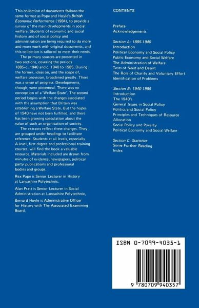This collection of documents follows the same format as Pope and Hoyle's British Economic Performance (1984), to provide a survey of the main developments in social welfare. Students of economic and social history and of social policy and administration are being required to do more and more work with original documents, and this collection is tailored to meet their needs. The primary sources are presented in two sections, covering the periods 1885-c. 1940 and c. 1940 to 1985. During the former, ideas on, and the scope of, welfare provision, broadened greatly. There was a sense of progress. Developments though were piecemeal. There was no conception of a 'Welfare State'. The second period begins with the changes associated with the assumption that Britain was establishing a Welfare State. But the hopes of 1940 have not been fulfilled, and there has been growing speculation about the value of such an organisation of society. The extracts reflect these changes. They are grouped under the headings to facilitate reference. Students at all levels, especially A-level, first degree and professional training courses, will find the book a valuable resource. Materials included are drawn from minutes of evidence, newspapers, political party publications and professional bodies and groups.