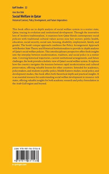 This book offers an in-depth analysis of social welfare system in a rentier state, Qatar, tracing its evolution and institutional development. Through the innovative lens of 'modern traditionalism,' it examines how Qatar blends contemporary social policies with traditional cultural values across nine key sectors: public health, education, social security, social care, housing, disability, employment, family, and gender. The book's unique approach combines the Policy Arrangement Approach with Rentier State Theory and Historical Institutionalism to provide in-depth analyses of Qatar's social welfare policies. This interdisciplinary perspective offers fresh insights into the interplay between modernization, tradition, and social policy in a rentier state. Covering historical trajectories, current institutional arrangements, and future challenges, the book provides a holistic view of Qatar's social welfare system. It explores how the country navigates the tensions between rapid modernization and cultural preservation, offering valuable lessons for other countries. Intended for academics, policymakers, and students in public policy, Middle Eastern studies, social policy, and development studies, this book offers both theoretical depth and practical insights. It is an essential resource for understanding social welfare development in resource-rich states, offering valuable insights for both academic research and policy formulation in the Arab Gulf region and beyond.