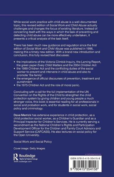 While social work practice with child abuse is a well-documented topic, this revised edition of Social Work and Child Abuse actually challenges and changes the focus of existing literature. Instead of concerning itself with the ways in which the task of preventing and detecting child abuse can be more effectively undertaken, it presents a critical analysis of the task itself. There has been much new guidance and regulation since the first edition of Social Work and Child Abuse was published in 1996, making this a timely new edition. With a brand new introduction and conclusion, this fully revised text discusses: the implications of the Victoria Climbié Inquiry, the Laming Report, the Green Paper Every Child Matters and the 2004 Children Act the 1989 Children Act and the conflicting duties of the social worker to prevent and intervene in child abuse and also to promote 'the family' the emergence of official discourses of prevention, treatment and punishment the 1975 Children Act and the role of moral panic. Concluding with a call for the full implementation of the UN Convention on the Rights of the Child to strengthen the child protection system by giving children and young people a much stronger voice, this book is essential reading for all professionals in social and probation work, and for students in social work, social policy and criminology.