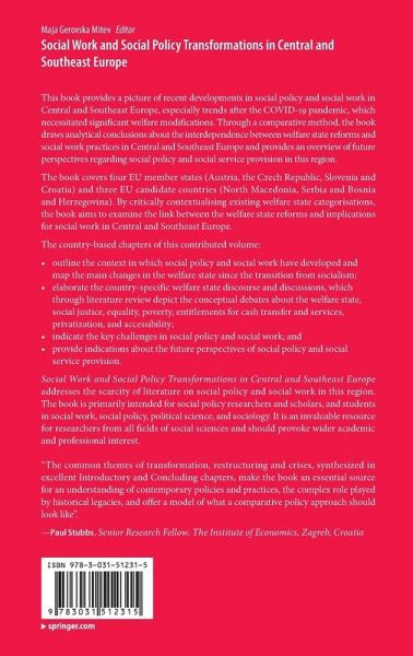This book provides a picture of recent developments in social policy and social work in Central and Southeast Europe, especially trends after the COVID-19 pandemic, which necessitated significant welfare modifications. Through a comparative method, the book draws analytical conclusions about the interdependence between welfare state reforms and social work practices in Central and Southeast Europe and provides an overview of future perspectives regarding social policy and social service provision in this region.