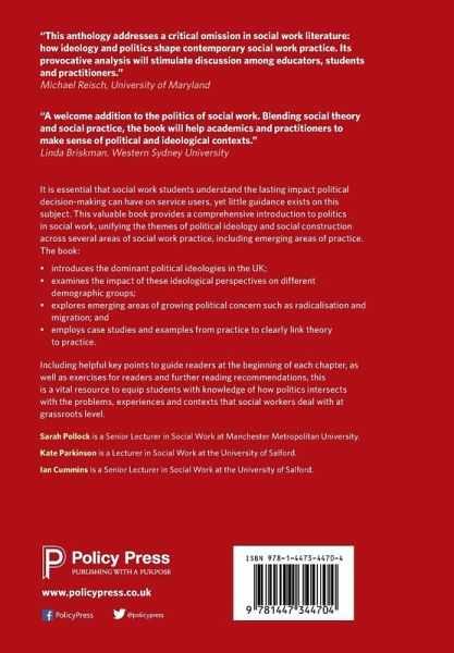 Introduction ~ Sarah Pollock Part 1: Political Ideologies in Context Socialism ~ Rich Moth Liberalism ~ Ian Cummins Conservatism ~ Ben Williams Neoliberalism ~ Ian Cummins Feminism ~ Lucy Mort Part 2: Social and Political Contexts of Practice Social Work with Adults ~ Alex Withers and Sarah Pollock Child Protection Social Work ~ Kate Parkinson Mental Health ~ Rich Moth and Scott Massie The Criminal Justice System ~ Ian Cummins PART 3: Emerging Themes and Issues Insecurity ~ Sarah Pollock Migration and Asylum ~ Philip Brown Child Sexual Abuse and Exploitation ~ Donna Peach Addiction ~ Chris Yianni Radicalisation ~ Ian Cummins Conclusion ~ Kate Parkinson
