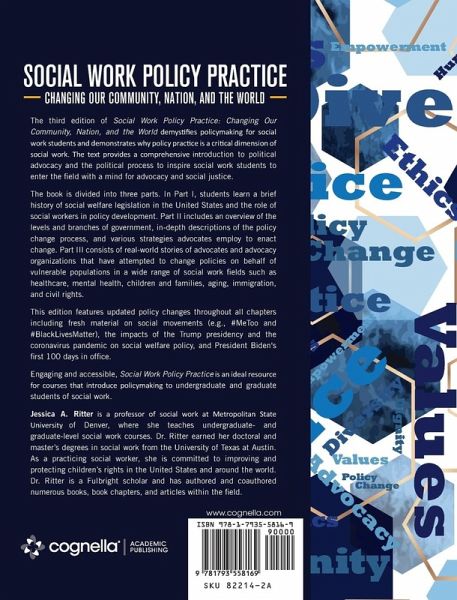 The third edition of Social Work Policy Practice: Changing Our Community, Nation, and the World demystifies policymaking for social work students and demonstrates why policy practice is a critical dimension of social work. The text provides a comprehensive introduction to political advocacy and the political process to inspire social work students to enter the field with a mind for advocacy and social justice. The book is divided into three parts. In Part I, students learn a brief history of social welfare legislation in the United States and the role of social workers in policy development. Part II includes an overview of the levels and branches of government, in-depth descriptions of the policy change process, and various strategies advocates employ to enact change. Part III consists of real-world stories of advocates and advocacy organizations that have attempted to change policies on behalf of vulnerable populations in a wide range of social work fields such as healthcare, mental health, children and families, aging, immigration, and civil rights. This edition features updated policy changes throughout all chapters including fresh material on social movements, such as #MeToo and #BlackLivesMatter, and the impacts of the Trump presidency and the coronavirus pandemic on social welfare policy. Engaging and accessible, Social Work Policy Practice is an ideal resource for courses that introduce policymaking to undergraduate and graduate students of social work.