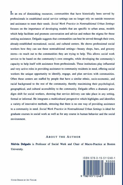 In an era of diminishing resources, communities that have historically been served by professionals in established social service settings can no longer rely on outside resources and assistance to meet their needs. Social Work Practice in Nontraditional Urban Settings focuses on the importance of developing models that are specific to urban areas, models which help facilitate and promote conversation and advice and reduce the stigma for those seeking assistance. Delgado suggests that communities can best be served through their own, already-established recreational, social, and cultural centers. He shows professional social workers how they can use these nontraditional settings -- beauty shops, bars, and grocery stores -- to reach out to the communities they are trying to help. This allows social work service to be based on the community's own strengths, while developing the community's capacity to help itself with assistance from professionals. These institutions play influential and very active roles in providing assistance to community residents in need, offering social workers the unique opportunity to identify, engage, and plan services with communities. Often these centers are staffed by people that have a similar ethnic, socio-economic, and racial background to the rest of the community, thereby maximizing their psychological, geographical, and cultural accessibility to the community. Delgado offers a dramatic paradigm shift for social workers, showing that service delivery can take place in any setting, formal or informal. He integrates a multicultural perspective which highlights and identifies a variety of innovative methods, stressing that there is no one wayof providing assistance to a community in need. Social Work Practice in Nontraditional Urban Settings is ideal for graduate courses in social work as well as for any course in human behavior and the social environment.