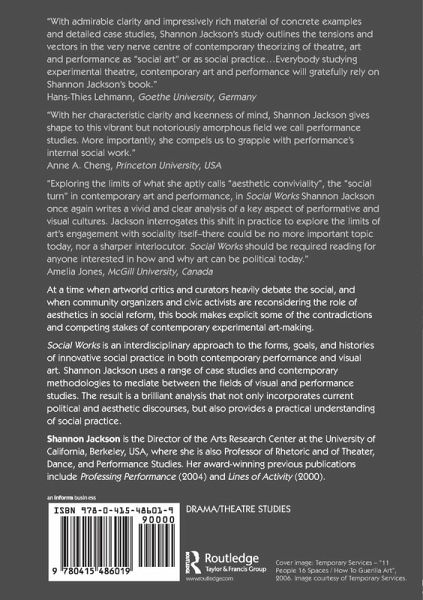 'Social Works is essential reading for anyone interested in the past, present and future of art at the intersection of performance and social practice. Shannon Jackson combines impeccable research and rigorous critical thinking with a lucid, approachable writing style. I have found this book invaluable in my work as both a curator and a critic.' Andy Horowitz, Founder, Culturebot.org