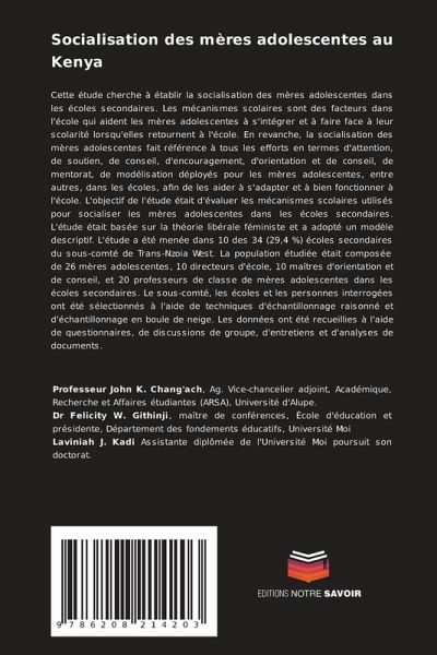 Cette étude cherche à établir la socialisation des mères adolescentes dans les écoles secondaires. Les mécanismes scolaires sont des facteurs dans l'école qui aident les mères adolescentes à s'intégrer et à faire face à leur scolarité lorsqu'elles retournent à l'école. En revanche, la socialisation des mères adolescentes fait référence à tous les efforts en termes d'attention, de soutien, de conseil, d'encouragement, d'orientation et de conseil, de mentorat, de modélisation déployés pour les mères adolescentes, entre autres, dans les écoles, afin de les aider à s'adapter et à bien fonctionner à l'école. L'objectif de l'étude était d'évaluer les mécanismes scolaires utilisés pour socialiser les mères adolescentes dans les écoles secondaires. L'étude était basée sur la théorie libérale féministe et a adopté un modèle descriptif. L'étude a été menée dans 10 des 34 (29,4 %) écoles secondaires du sous-comté de Trans-Nzoia West. La population étudiée était composée de 26 mères adolescentes, 10 directeurs d'école, 10 maîtres d'orientation et de conseil, et 20 professeurs de classe de mères adolescentes dans les écoles secondaires. Le sous-comté, les écoles et les personnes interrogées ont été sélectionnés à l'aide de techniques d'échantillonnage raisonné et d'échantillonnage en boule de neige. Les données ont été recueillies à l'aide de questionnaires, de discussions de groupe, d'entretiens et d'analyses de documents.