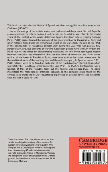 This book recovers the lost history of Spanish socialism during the turbulent years of the Civil War (1936-39). Just as the energy of the socialist movement had sustained the pre-war Second Republic as an experiment in reform, so too it underwrote the Republican war effort in the crucial years of the conflict which would determine Spain's long-term future. Leading Socialist Party (PSOE) cadres formed the bedrock of the government, while thousands of Party and union militants helped bear the tremendous weight of the war effort. The role of the PSOE in the construction of Republican political unity during the Civil War was pivotal. Yet, paradoxically, previous accounts of wartime Republican politics have virtually written the PSOE out of the script by concentrating exclusively on the fierce ideological dispute between anarchists and communists. But the key issues of revolution and State power marked all the forces in Republican Spain, none more so than the Socialist movement. As the traditional party of the working class and the only mass party in Spain as late as 1931, PSOE militants were to be found on both sides of the revolutionary/reformist divide which split fatally the Republican forces during the Civil War. The PSOE's disintegration was a function of that of the Republic itself; but the reverse was no less true. The book investigates the responses of organised socialism to the complex issues raised by the conflict, as it charts the PSOE's devastating experience of political power and desperate crisis in a war it could not win.