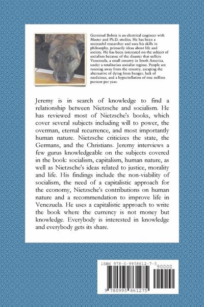 Jeremy is in search of knowledge to find a relationship between Nietzsche and socialism. He has reviewed most of Nietzsche's books, which cover several subjects including will to power, the overman, eternal recurrence, and most importantly human nature. Nietzsche criticizes the state, the Germans, and the Christians. Jeremy interviews a few gurus knowledgeable on the subjects covered in the book: socialism, capitalism, human nature, as well as Nietzsche's ideas related to justice, morality and life. His findings include the non-viability of socialism, the need of a capitalistic approach for the economy, Nietzsche's contributions on human nature and a recommendation to improve life in Venezuela. He uses a capitalistic approach to write the book where the currency is not money but knowledge. Everybody is interested in knowledge and everybody gets its share.