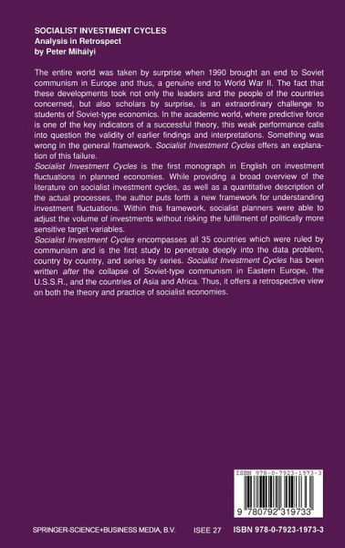 The entire world was taken by surprise when 1990 brought an end to Soviet communism in Europe and thus a genuine end to World War II. The fact that these developments surprised not only the leaders and the people of the countries concerned, but also scholars is an extraordinary challenge to the students of Soviet-type economics. In the academic world, where predictive force is one of the key indicators of a successful theory, this weak performance calls into question the validity of earlier findings and interpretations. Something was wrong in the general framework. Socialist Investment Cycles offers an explanation of this failure.