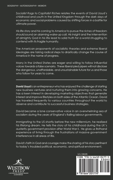Socialist Rags to Capitalist Riches relates the events of David Lloyd's childhood and youth in the United Kingdom through the dark days of economic and social problems caused by shifting forces in a battle for ultimate power. His life story and his coming to America to pursue the riches of freedom should sound an alarming wake-up call. His insight and the intervention of almighty God in his life lead to solid truth for a world struggling to contend with its fragile humanity. The American proponents of socialistic theories and extreme liberal ideologies are taking radical steps to drastically change the course of America in the name of progress. Many in the United States are eager and willing to follow influential voices towards a false scenario. These liberal pied pipers will not disclose the dangerous, unaffordable, and unsustainable future for us and those who follow for years to come.