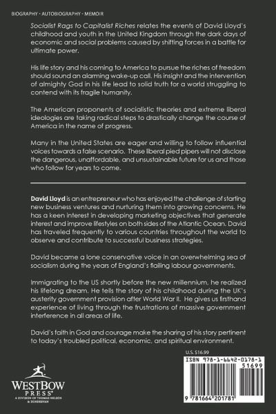 Socialist Rags to Capitalist Riches relates the events of David Lloyd's childhood and youth in the United Kingdom through the dark days of economic and social problems caused by shifting forces in a battle for ultimate power. His life story and his coming to America to pursue the riches of freedom should sound an alarming wake-up call. His insight and the intervention of almighty God in his life lead to solid truth for a world struggling to contend with its fragile humanity. The American proponents of socialistic theories and extreme liberal ideologies are taking radical steps to drastically change the course of America in the name of progress. Many in the United States are eager and willing to follow influential voices towards a false scenario. These liberal pied pipers will not disclose the dangerous, unaffordable, and unsustainable future for us and those who follow for years to come.