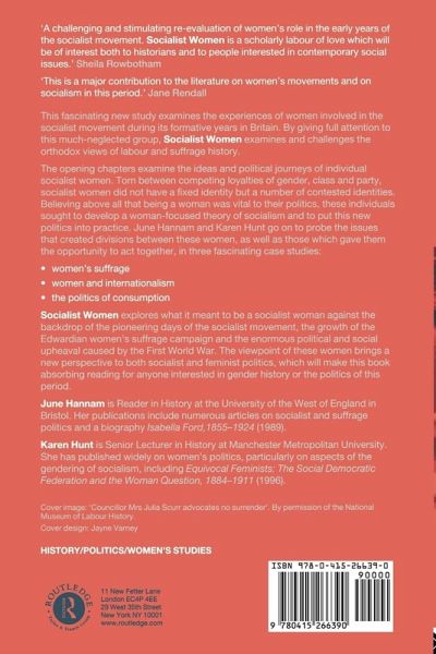 This fascinating new study examines the experiences of women involved in the socialist movement during its formative years in Britain and the active role they played in campaigning for the vote. By giving full attention to this much-neglected group of women, Socialist Women examines and challenges the orthodox views of labour and suffrage history. Torn between competing loyalties of gender, class and politics, socialist women did not have a fixed identity but a number of contested identities. June Hannam and Karen Hunt probe issues that created divisions between these women, as well as giving them the opportunity to act together. In three fascinating case studies they explore: * women's suffrage * women and internationalism * the politics of consumption. Believing above all that being a woman was vital to their politics, these individuals sought to develop a woman-focused theory of socialism and to put this new politics into practice.