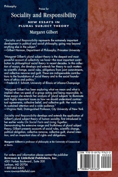 One of the most distinguished living social philosophers, Margaret Gilbert develops and extends her application of plural subject theory of human sociality, first introduced in her earlier works On Social Facts and Living Together. Sociality and Responsibility presents an extended discussion of her proposal that joint commitments inherently involve obligations and rights, proposing, in effect, a new theory of obligations and rights. In addition, it demonstrates the extensive range and fruitfulness of plural subject theory by presenting accounts of social rules, scientific change, political obligation, collective remorse, collective guilt, shared intention and an important class of rights and obligations.