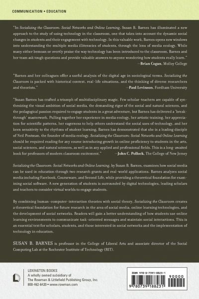 Socializing the Classroom: Social Networks and Online Learning, by Susan B. Barnes, examines how social media can be used in education through two research grants and real-world applications. Barnes analyzes social media including Facebook, Courseware, and Second Life, while providing a theoretical foundation for examining social software. A new generation of students is surrounded by digital technologies, leading scholars and teachers to consider virtual worlds to engage students. By bringing together human-computer-interaction theories with social theory, Socializing the Classroom creates a theoretical foundation for future research in the area of social media, online learning technologies, and the development of social networks. Readers will gain a better understanding of how students use online learning environments to communicate task-oriented messages and maintain social interactions. This is an essential text for scholars, students, and those interested in social networks and the implementation of technology in education.