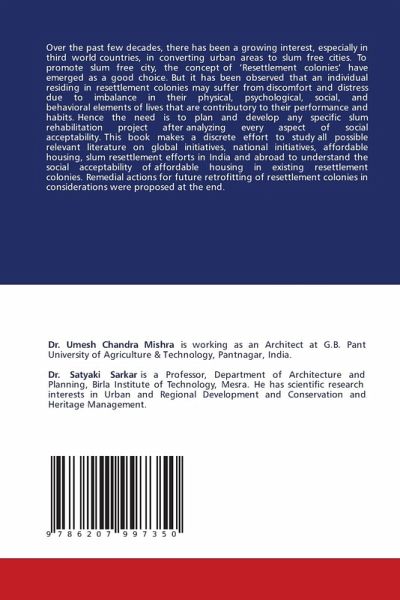 Over the past few decades, there has been a growing interest, especially in third world countries, in converting urban areas to slum free cities. To promote slum free city, the concept of 'Resettlement colonies' have emerged as a good choice. But it has been observed that an individual residing in resettlement colonies may suffer from discomfort and distress due to imbalance in their physical, psychological, social, and behavioral elements of lives that are contributory to their performance and habits. Hence the need is to plan and develop any specific slum rehabilitation project after analyzing every aspect of social acceptability. This book makes a discrete effort to study all possible relevant literature on global initiatives, national initiatives, affordable housing, slum resettlement efforts in India and abroad to understand the social acceptability of affordable housing in existing resettlement colonies. Remedial actions for future retrofitting of resettlement colonies in considerations were proposed at the end.