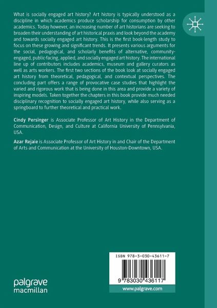 1. Introduction (Azar Rejaie).- Part 1 Envisioning.- 2 Introduction to Envisioning (Cindy Persinger).- 3 What is Socially Engaged Art History? (Cindy Persinger).- 4 Cultivating an Engaged Art History from Interdisciplinary Roots (Laura Holzman).- 5 Art History and its Publics: Weighing the Pedagogical and Research Benefits ofCommunity-Engagement (Julia Sienkowicz).- 6 Visual Critical Pedagogy in High School: Students Offer an Alternative to the Official Art Curriculum (Ya'ara Gil-Glazer).- Part 2 Intersections.- 7 Introduction to Intersections (Azar Rejaie).- 8 Applied Art History: Theory and Praxis (Jenna Ann Altomonte).- 9 The Course Has Left the Classroom: Community Engagement, Consensus Building and Experiential Learning as Socially Engaged Art History (Jonathan Wallis).- 10 ObservingLight and Catching Reflections: Experiential Environmentally Centered Art Historical Practice In and Outside the Classroom (Kelly A. Wacker).- 11 Public Sculpture Exhibitions in Neighborhoods: Arts-Driven, Heritage-Based, Urban Revitalization, and Social Practice (Part 1) (Hilary A. Braysmith).- 12 Curatorial Practice as (Place) Making: Social Imagination, Cultural Laboratories, and Public Space in Madrid (2008-2015) (Olga Fernández López, Azucena Klett, andZoe López Mediero).- 13 Making Worlds: Normative and Other Art Histories of Visually Impaired Photographers (Vendela Grundell Gachoud).- Part 3 Implementation.- 14 Introduction to Implementation (Cindy Persinger).- 15 The Power of Silence: Ahmet Ögüt's The Silent University (2012-Ongoing) (Luisa Santos).- 16 Curating to Remember Injustice: Exhibitions on Toyo Miyatake and Roger Shimomura (Aileen June Wang).- 17 HAIR CLUB: A Case Study for Socially Engaged Art History (Suzanne Gold, Kelly Lloyd, and Michal Lynn Shumate).- 18 The Running Fence Corporation, LLC and Sociality (John-Michael H. Warner).- 19 Turning Students into Social Practitioners and Neighborhood Youths and Young Adults into Project Assistants: Arts-Driven, Heritage-Based, Urban Revitalization, and Social Practice (Part 2) (Hilary A. Braysmith).- 20 Building Community (Art) History in "Standing Together: the Selma Burke Project (Terri Baltimore and Julia Sienkowicz).- 21 Student Docent Projects as Socially Engaged Art History (Rebecka A. Black and Carissa DiCindio).- 22 Structuring Academic Jobs for Engaged Art History (Laura M. Holzman).- 23 Reflections on Socially Engaged History (Cindy Persinger).