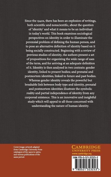 Since the 1940s, there has been an explosion of writings, both scientific and nonscientific, about the question of 'identity' and what it means to be an individual in today's world. This book examines sociological perspectives on identity in order to illuminate the perennial problem of defining the human person, and to pose an alternative definition of identity based on it being socially constructed. Beginning with a review of previous studies of identity, the authors present a set of propositions for organizing the wide range of uses of the term, and for arriving at an adequate definition of it. Identity is then analysed in two contexts: gender identity, linked to present bodies; and prenatal and postmortem identities, linked to future and past bodies. Whereas gender identity reveals the powerful but breakable link between body type and identity, prenatal and postmortem identities illustrate the symbolic reality and partial independence of identity from any corporeal existence. This is an innovative and insightful study which will appeal to all those concerned with understanding the nature of human identity.