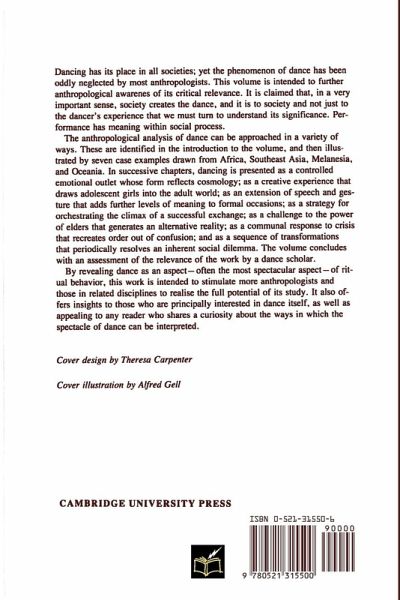 Dancing has its place in all societies; yet the phenomenon of dance has been oddly neglected by most anthropologists. This volume is intended to further anthropological awarenes of its critical relevance. It is claimed that, in a very important sense, society creates the dance, and it is to society and not just to the dancer's experience that we must turn to understand its significance. Performance has meaning within social process. The anthropological analysis of dance can be approached in a variety of ways. These are identified in the introduction to the volume, and then illustrated by seven case examples drawn from Africa, Southeast Asia, Melanesia, and Oceania. In successive chapters, dancing is presented as a controlled emotional outlet whose form reflects cosmology; as a creative experience that draws adolescent girls into the adult world; as an extension of speech and gesture that adds further levels of meaning to formal occasions: as a strategy for orchestrating the climax of a successful exchange; as a challenge to the power of elders that generates an alternative reality; as a communal response to crisis that recreates order out of confusion: and as a sequence of transformations that periodically resolves an inherent social dilemma. The volume concludes with an assessment of the relevance of the work by a dance scholar. By revealing dance as an aspect -- often the most spectacular aspect -- of ritual behavior, this work is intended to stimulate more anthropologists and those in related disciplines to realise the full potential of its study. It also offers insights to those who are principally interested in dance itself, as well as appealing to any reader who shares acuriosity about the ways in which the spectacle of dance can be interpreted.