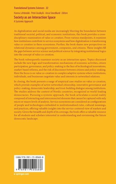 As digitalization and social media are increasingly blurring the boundaries between traditional societal, political, and economic institutions, this book provides a cross-disciplinary examination of value co-creation. From various standpoints, it examines how institutions contribute to service ecosystems and how digitalization is transforming value co-creation in these ecosystems. Further, the book shares new perspectives on relational dynamics among government, companies, and citizens. These insights fill the gaps between service science and political science by integrating institutional logics into the concept of value co-creation. The book subsequently examines society as an interaction space. Topics discussed include the new logic and transformation mechanisms of economic activities, citizen participation, governance, and policy-making in the face of technological innovations, market-based reforms, and the risk of disconnect between citizens and policy-making. Here the focus is on value co-creation in complex adaptive systems where institutions, individuals, and businesses negotiate value and interests in networked relations.