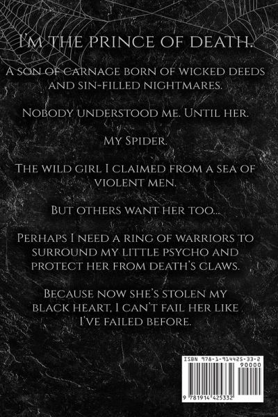 I'm the prince of death. A son of carnage born of wicked deeds and sin-filled nightmares. Nobody understood me. Until her. My Spider. The wild girl I claimed from a sea of violent men. But others want her too... The enemies who lurk within my walls seek to steal her from my grasp. They're my captives, but maybe they're the answer to my greatest fear too. Because the Grim Reaper shadows every move I make, and he's always watching her. Perhaps I need a ring of warriors to surround my little psycho and protect her from death's claws. Because now she's stolen my black heart, I can't fail her like I've failed before.