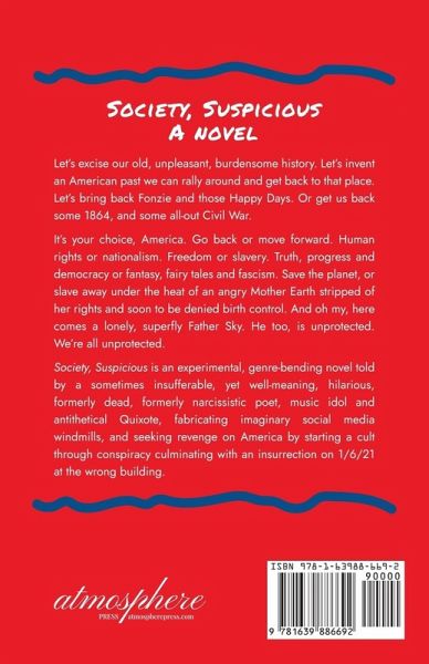 Let's excise our old, unpleasant, burdensome history. Let's invent an American past we can rally around and get back to that place. Let's bring back Fonzie and those Happy Days. Or get us back some 1864, and some all-out Civil War. It's your choice, America. Go back or move forward. Human rights or nationalism. Freedom or slavery. Truth, progress and democracy or fantasy, fairy tales and fascism. Save the planet, or slave away under the heat of an angry Mother Earth stripped of her rights and soon to be denied birth control. And oh my, here comes a lonely, superfly Father Sky. He too, is unprotected. We're all unprotected. Society, Suspicious is an experimental, genre-bending novel told by a sometimes insufferable, yet well-meaning, hilarious, formerly dead, formerly narcissistic poet, music idol and antithetical Quixote, fabricating imaginary social media windmills, and seeking revenge on America by starting a cult through conspiracy culminating with an insurrection on 1/6/21 at the wrong building.