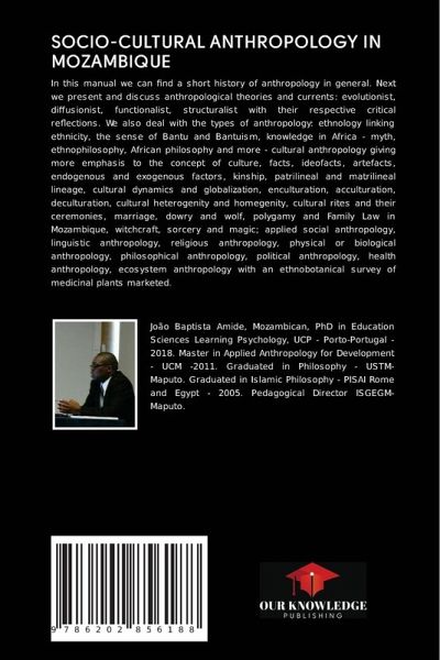 In this manual we can find a short history of anthropology in general. Next we present and discuss anthropological theories and currents: evolutionist, diffusionist, functionalist, structuralist with their respective critical reflections. We also deal with the types of anthropology: ethnology linking ethnicity, the sense of Bantu and Bantuism, knowledge in Africa - myth, ethnophilosophy, African philosophy and more - cultural anthropology giving more emphasis to the concept of culture, facts, ideofacts, artefacts, endogenous and exogenous factors, kinship, patrilineal and matrilineal lineage, cultural dynamics and globalization, enculturation, acculturation, deculturation, cultural heterogenity and homegenity, cultural rites and their ceremonies, marriage, dowry and wolf, polygamy and Family Law in Mozambique, witchcraft, sorcery and magic; applied social anthropology, linguistic anthropology, religious anthropology, physical or biological anthropology, philosophical anthropology, political anthropology, health anthropology, ecosystem anthropology with an ethnobotanical survey of medicinal plants marketed.