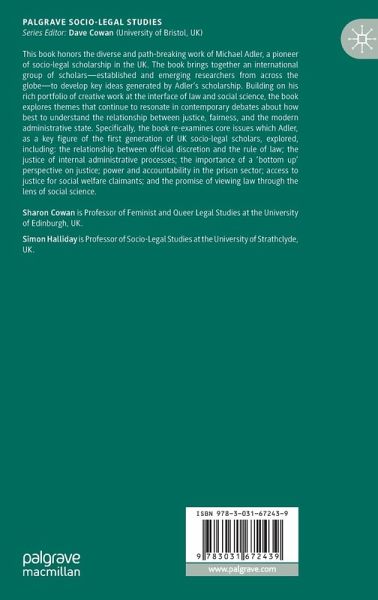 This book honors the diverse and path-breaking work of Michael Adler, a pioneer of socio-legal scholarship in the UK. The book brings together an international group of scholars-established and emerging researchers from across the globe-to develop key ideas generated by Adler's scholarship. Building on his rich portfolio of creative work at the interface of law and social science, the book explores themes that continue to resonate in contemporary debates about how best to understand the relationship between justice, fairness, and the modern administrative state. Specifically, the book re-examines core issues which Adler, as a key figure of the first generation of UK socio-legal scholars, explored, including: the relationship between official discretion and the rule of law; the justice of internal administrative processes; the importance of a 'bottom up' perspective on justice; power and accountability in the prison sector; access to justice for social welfare claimants; and the promise of viewing law through the lens of social science.