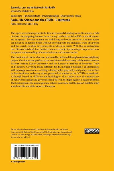 This book aims to show what can, and could be, achieved through our interdisciplinary project. One important product is the newly formed three-party collaboration between Pasteur Institut, Kyoto University, and the Research Institute of Economy, Trade and Industry. Covering many different fields, including medicine, epidemiology, anthropology, economics, sociology, demography, geography, and policy,researchers in these institutes, and many others, present their studies on the COVID-19 pandemic. Although based on different methodologies, the studies show the importance of behavioral change and governmental policy in the fight against a huge pandemic. The book explains the unique genome cohort-panel data that the project builds to study social and life scientific aspects of humans.