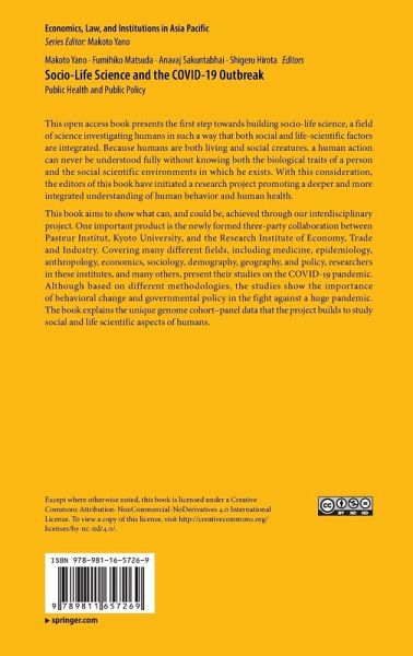 This book aims to show what can, and could be, achieved through our interdisciplinary project. One important product is the newly formed three-party collaboration between Pasteur Institut, Kyoto University, and the Research Institute of Economy, Trade and Industry. Covering many different fields, including medicine, epidemiology, anthropology, economics, sociology, demography, geography, and policy,researchers in these institutes, and many others, present their studies on the COVID-19 pandemic. Although based on different methodologies, the studies show the importance of behavioral change and governmental policy in the fight against a huge pandemic. The book explains the unique genome cohort-panel data that the project builds to study social and life scientific aspects of humans.