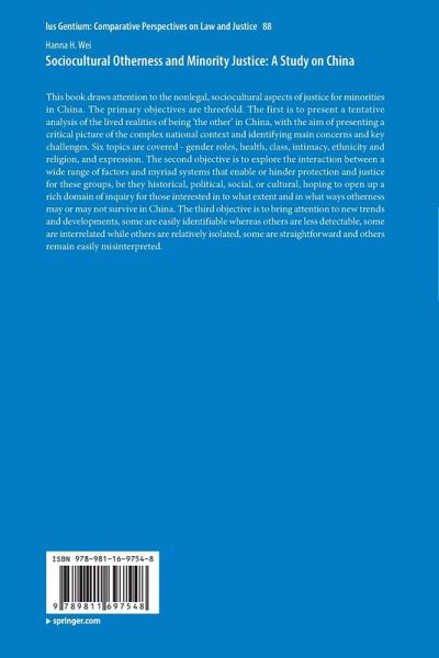 This book draws attention to the nonlegal, sociocultural aspects of justice for minorities in China. The primary objectives are threefold. The first is to present a tentative analysis of the lived realities of being 'the other' in China, with the aim of presenting a critical picture of the complex national context and identifying main concerns and key challenges. Six topics are covered - gender roles, health, class, intimacy, ethnicity and religion, and expression. The second objective is to explore the interaction between a wide range of factors and myriad systems that enable or hinder protection and justice for these groups, be they historical, political, social, or cultural, hoping to open up a rich domain of inquiry for those interested in to what extent and in what ways otherness may or may not survive in China. The third objective is to bring attention to new trends and developments, some are easily identifiable whereas others are less detectable,some are interrelated while others are relatively isolated, some are straightforward and others remain easily misinterpreted.
