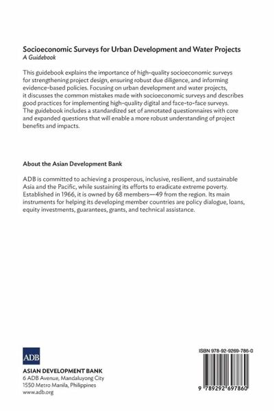 This guidebook provides practical tips and resources for conducting quality socioeconomic surveys to enhance the effectiveness of urban development and water projects. It explains the importance of high-quality socioeconomic surveys to strengthen project design, ensure robust due diligence, and inform evidence-based policies. Focusing on urban development and water projects, the guidebook discusses common mistakes made with socioeconomic surveys and provides good practices for implementing high quality face-to-face and digital surveys. It includes a standardized set of annotated questionnaires that consist of basic questions as well as expanded questions that enable a more robust understanding of project impacts.