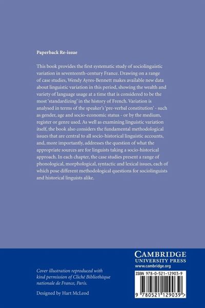 This book provides a systematic study of sociolinguistic variation in seventeenth-century France. Drawing on a range of case studies, Wendy Ayres-Bennett makes available data about linguistic variation in this period, showing the wealth and variety of language usage at a time that is considered to be the most 'standardising' in the history of French. Variation is analysed in terms of the speaker's 'pre-verbal constitution' - such as gender, age and socio-economic status - or by the medium, register or genre used. As well as examining linguistic variation itself, the book also considers the fundamental methodological issues that are central to all socio-historical linguistic accounts and, more importantly, addresses the question of what the appropriate sources are for linguists taking a socio-historical approach. In each chapter, the case studies present a range of phonological, morphological, syntactic and lexical issues, which pose different methodological questions for sociolinguists and historical linguists alike.