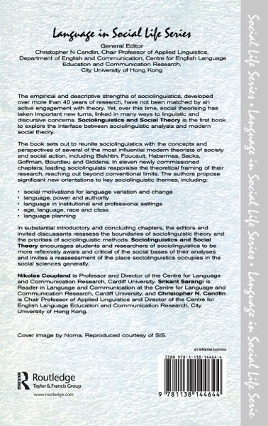 Sociolinguistics and Social Theory brings together new critical overviews of the interface between language, social structure and social action. A wide range of theoretical and methodological traditions are represented: variationist and ethnographic sociolinguistics, conversation and interaction analysis, discourse analysis, social semiotics and ideological linguistics, as well as sociology and social theory itself. The book proposes a new agenda for sociolinguistic theory, in the broadest sense, and debates the theoretical grounding of different research methods. Contributors include Frederick Erickson, David Graddol, Christian Heath, Monica Heller, John Heritage, Gunther Kress, Per Linell, Michael Lynch, Miriam Meyerhoff, Lesley Milroy, Jonathan Potter, Ben Rampton, Celia Roberts, Richard Watts, John Wilson and Ruth Wodak.