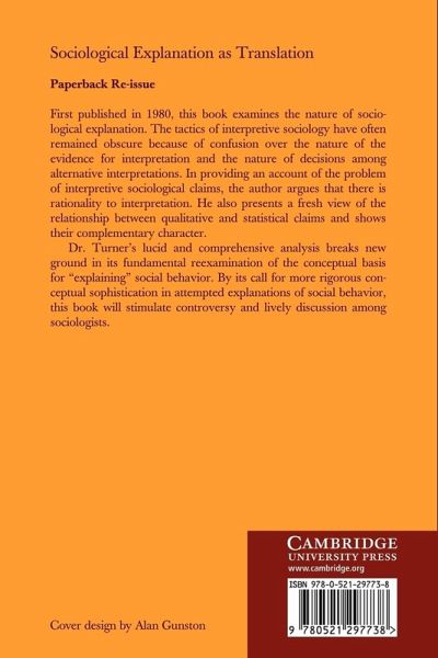 First published in 1980, this book examines the nature of sociological explanation. The tactics of interpretive sociology have often remained obscure because of confusion over the nature of the evidence for interpretation and the nature of decisions among alternative interpretations. In providing an account of the problem of interpretive sociological claims, the author argues that there is rationality to interpretation. He also presents a fresh view of the relationship between qualitative and statistical claims and shows their complementary character. Dr. Turner's lucid and comprehensive analysis breaks new ground in its fundamental re-examination of the conceptual basis for "explaining" social behaviour. By its call for more rigourous conceptual sophistication in attempted explanations of social behaviour, this book will stimulate controversy and lively discussion among sociologists.