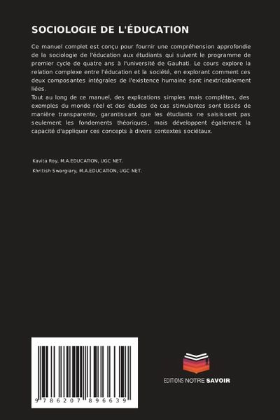 Ce manuel complet est conçu pour fournir une compréhension approfondie de la sociologie de l'éducation aux étudiants qui suivent le programme de premier cycle de quatre ans à l'université de Gauhati. Le cours explore la relation complexe entre l'éducation et la société, en explorant comment ces deux composantes intégrales de l'existence humaine sont inextricablement liées.Tout au long de ce manuel, des explications simples mais complètes, des exemples du monde réel et des études de cas stimulantes sont tissés de manière transparente, garantissant que les étudiants ne saisissent pas seulement les fondements théoriques, mais développent également la capacité d'appliquer ces concepts à divers contextes sociétaux.
