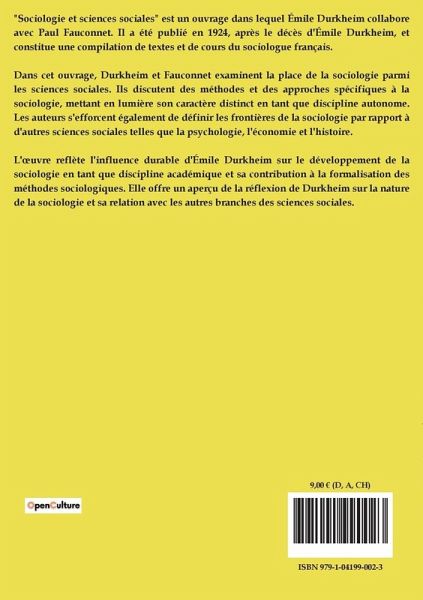 "Sociologie et sciences sociales" est un très court ouvrage dans lequel Émile Durkheim collabore avec Paul Fauconnet. Il a été publié en 1924, après le décès d'Émile Durkheim, et constitue une compilation de textes et de cours du sociologue français. Dans cet ouvrage, Durkheim et Fauconnet examinent la place de la sociologie parmi les sciences sociales. Ils discutent des méthodes et des approches spécifiques à la sociologie, mettant en lumière son caractère distinct en tant que discipline autonome. Les auteurs s'efforcent également de définir les frontières de la sociologie par rapport à d'autres sciences sociales telles que la psychologie, l'économie et l'histoire. L'¿uvre reflète l'influence durable d'Émile Durkheim sur le développement de la sociologie en tant que discipline académique et sa contribution à la formalisation des méthodes sociologiques. Elle offre un aperçu de la réflexion de Durkheim sur la nature de la sociologie et sa relation avec les autres branches des sciences sociales.