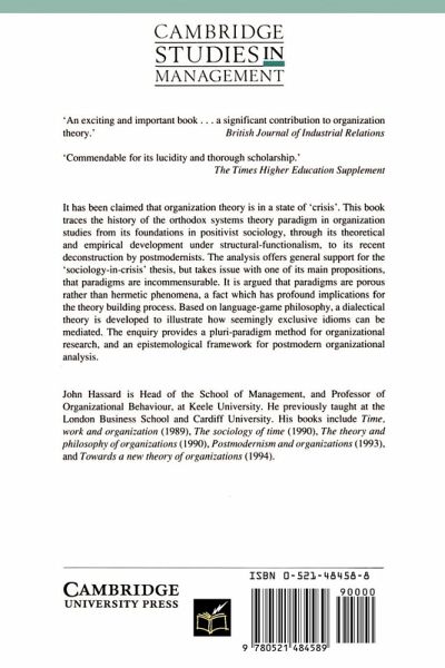 It has been claimed that organization theory is in a state of 'crisis'. This book traces the history of the orthodox systems theory paradigm in organization studies from its foundations in positivist sociology, through its theoretical and empirical development under structural-functionalism, to its recent deconstruction by postmodernists. The analysis offers general support for the 'sociology-in-crisis' thesis, but takes issue with one of its main propositions, that paradigms are incommensurable. It is argued that paradigms are porous rather than hermetic phenomena, a fact which has profound implications for the theory building process. Based on language-game philosophy, a dialectical theory is developed to illustrate how seemingly exclusive idioms can be mediated. The enquiry provides a pluri-paradigm method for organizational research, and an epistemological framework for postmodern organizational analysis.